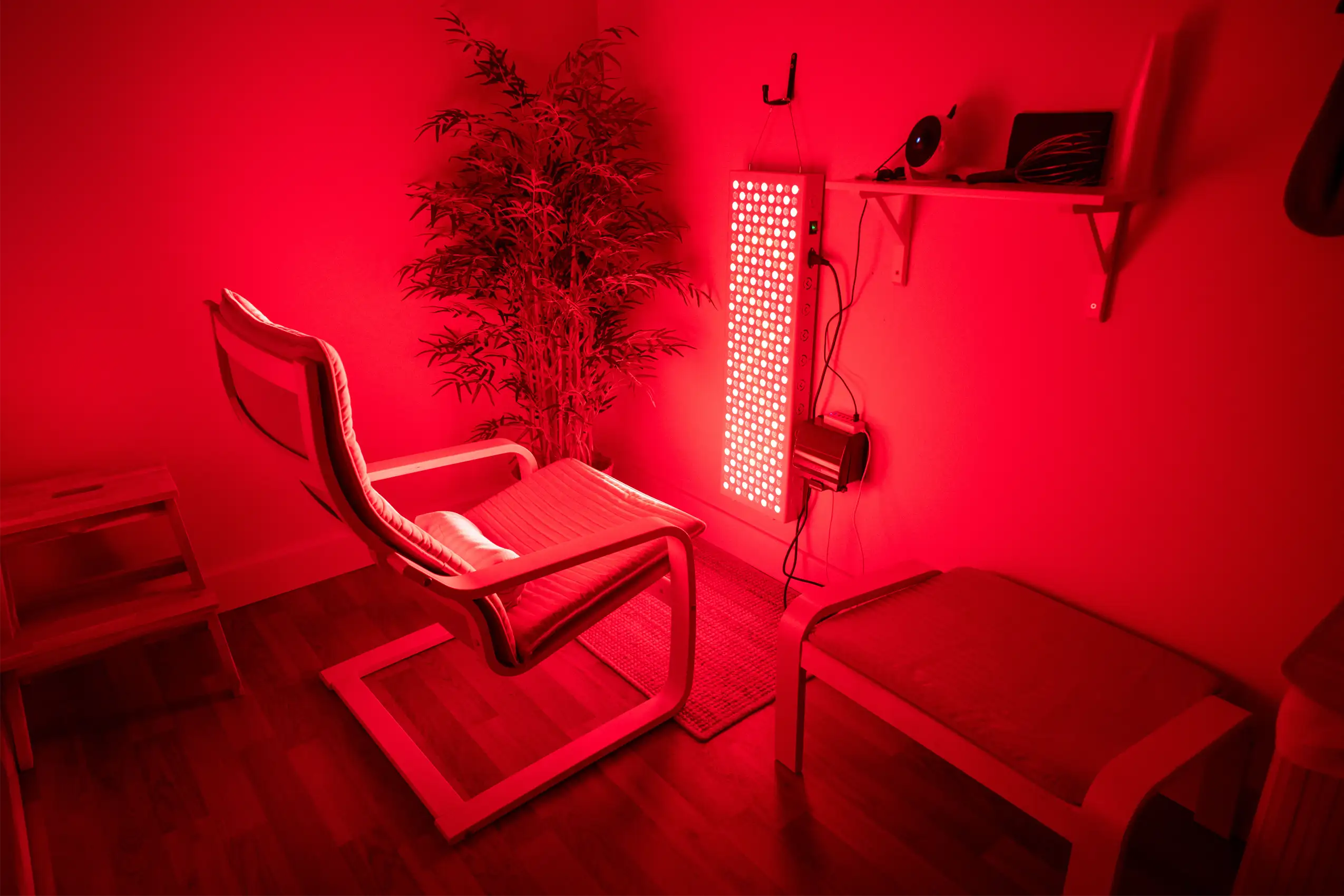 • Red light therapy panel with recliner chair; relax in comfort as targeted light wavelengths work at a cellular level to repair, restore and energise